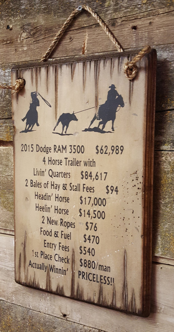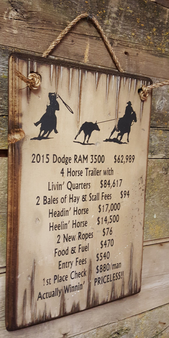 This sums up the life of the team roper perfectly. Actually winning a check is PRICELESS! This white background sign measures 11x17 and comes with the grass rope hanger for easy hanging! Handcrafted with pride!
