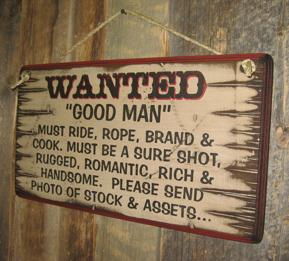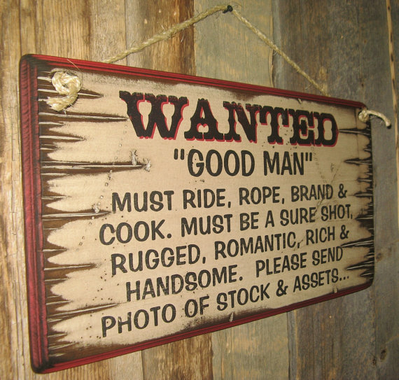 WANTED: "Good Man" Must ride, rope, brand & cook. Must be a sure shot, rugged, romantic, rich & handsome. Please send photo of stock & assets. This humorous sign is sure to bring a smile to your face. This sign measures 11x21, has a white background and red painted edge. It comes with the grass rope hanger for easy hanging. Handcrafted with pride!!