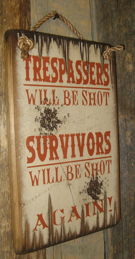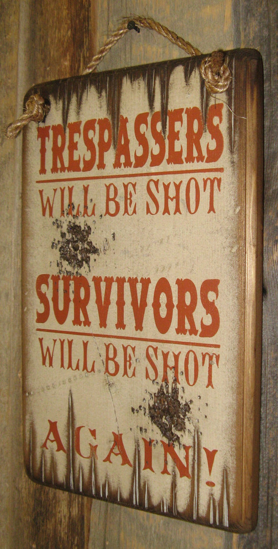 Trespassers Will Be Shot, Survivors Will Be Shot Again!! This sign looks like it's even been shot! Hang this out to warn those trespassers or nosy neighbors!! This sign has a white background and measures 9x14. It comes with the grass rope hanger for easy hanging. Handcrafted with pride!