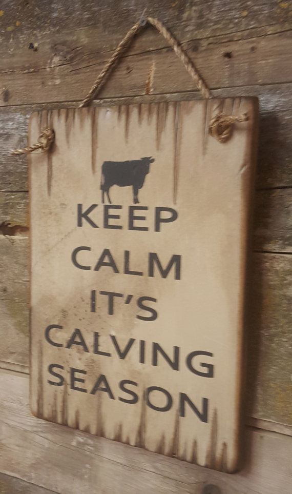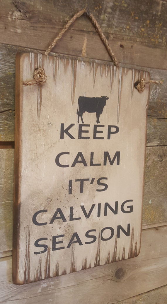 Keep Calm, It's Calving Season! Take a deep breath, it will all be over soon! This white background sign measures 11x15 and is a good reminder to keep calm during this hectic time of year. It comes with the grass rope hanger for easy hanging. Handcrafted with pride!!