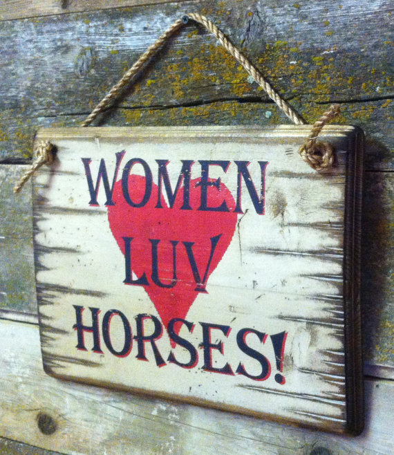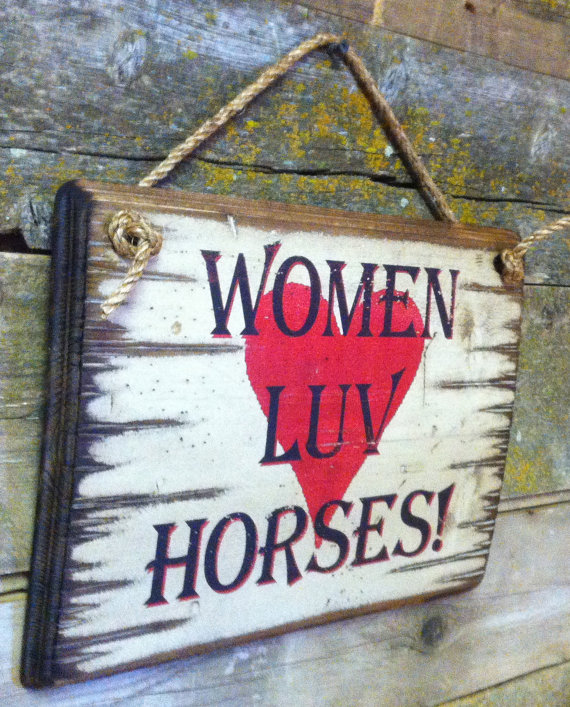 WOMEN LUV HORSES! This sign is for those girls that are fanatics about their horses! This white background sign measures 11x15 and comes with the grass rope hanger for easy hanging. Handcrafted with pride!