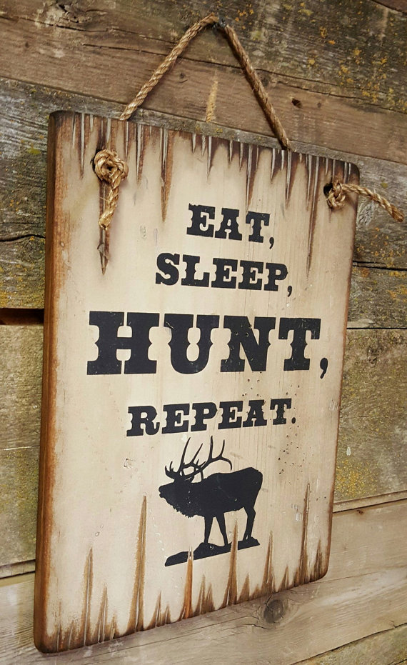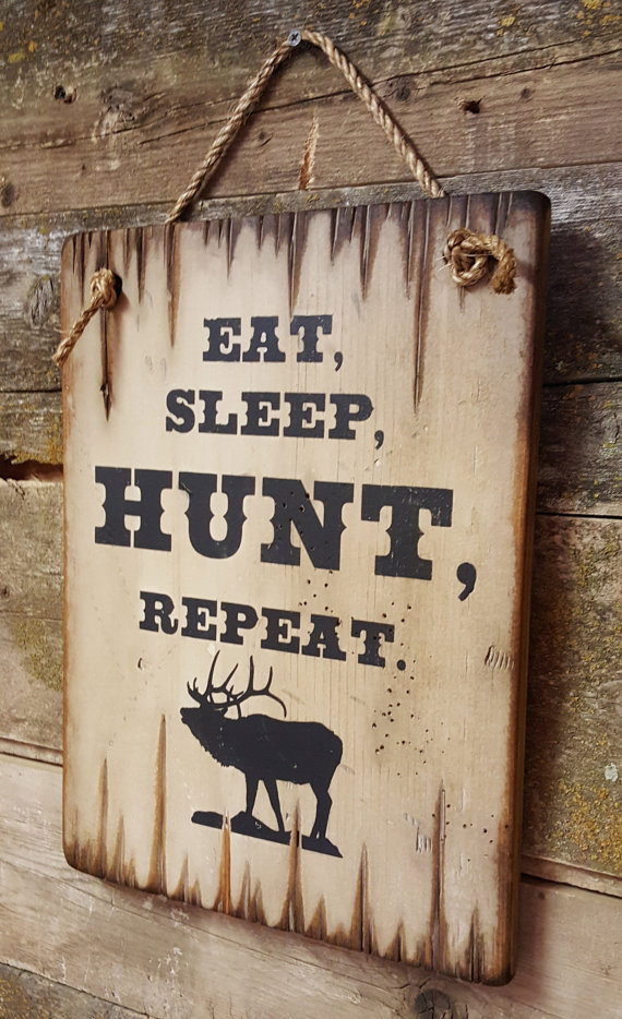 Eat, Sleep, HUNT, Repeat! This is perfect for the hunter in your life that has it all! When all they think about is HUNTING!! This white background sign measures 11x15 and comes with the grass rope hanger for easy hanging. Handcrafted with pride!!