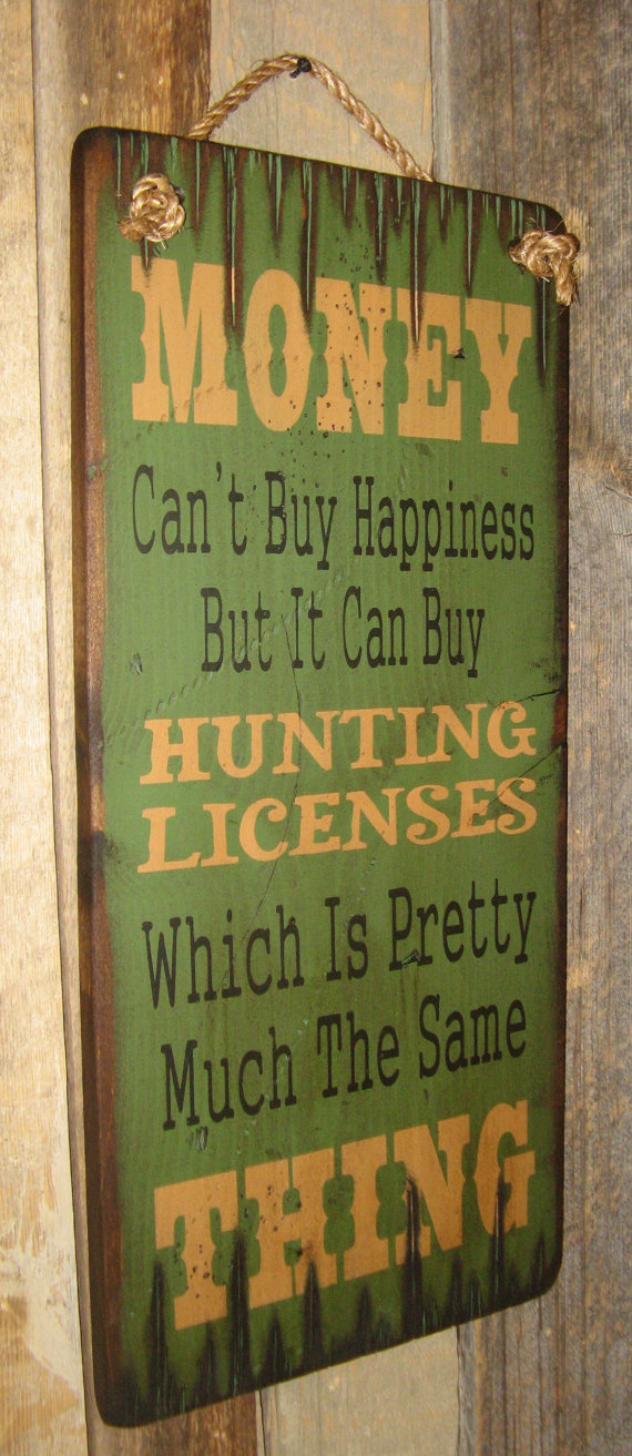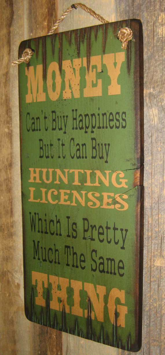 Money Can't Buy Happiness… But It Can Buy Hunting Licenses, Which Is Pretty Much The Same Thing! If this isn't true for some people (most of my family included)!! This dark green background sign measures 11x24 and comes with the grass rope hanger for easy hanging! Handcrafted with pride!! Customize the colors to match your "Man or Woman Cave"