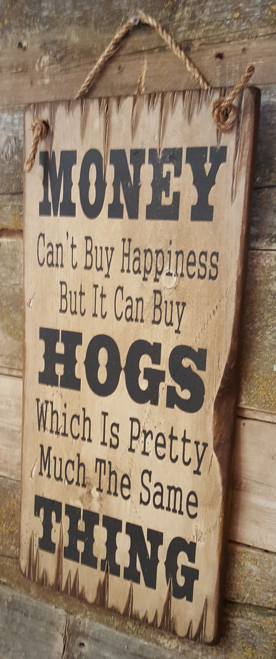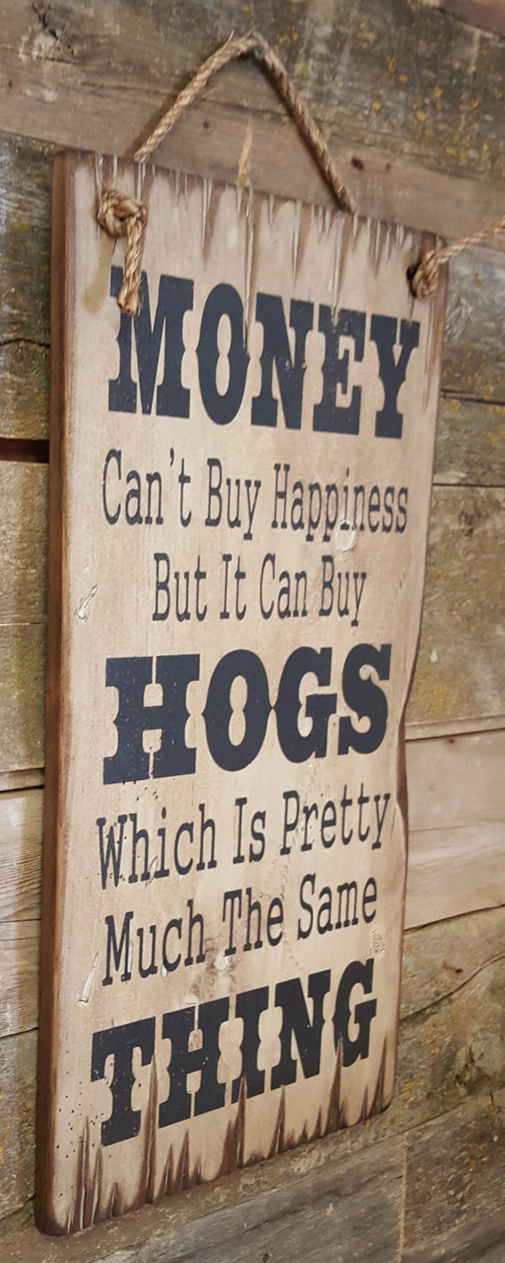 Money Can't Buy Happiness, But It Can Buy Hogs, Which Is Pretty Much The Same Thing!! Do you love those cute little oinkers?? Then this sign is for you! This white background sign measures 11x24 and comes with the grass rope hanger for easy hanging! Handcrafted with pride!!