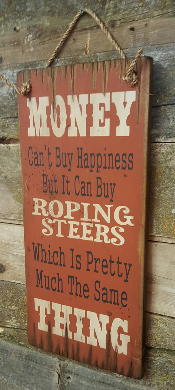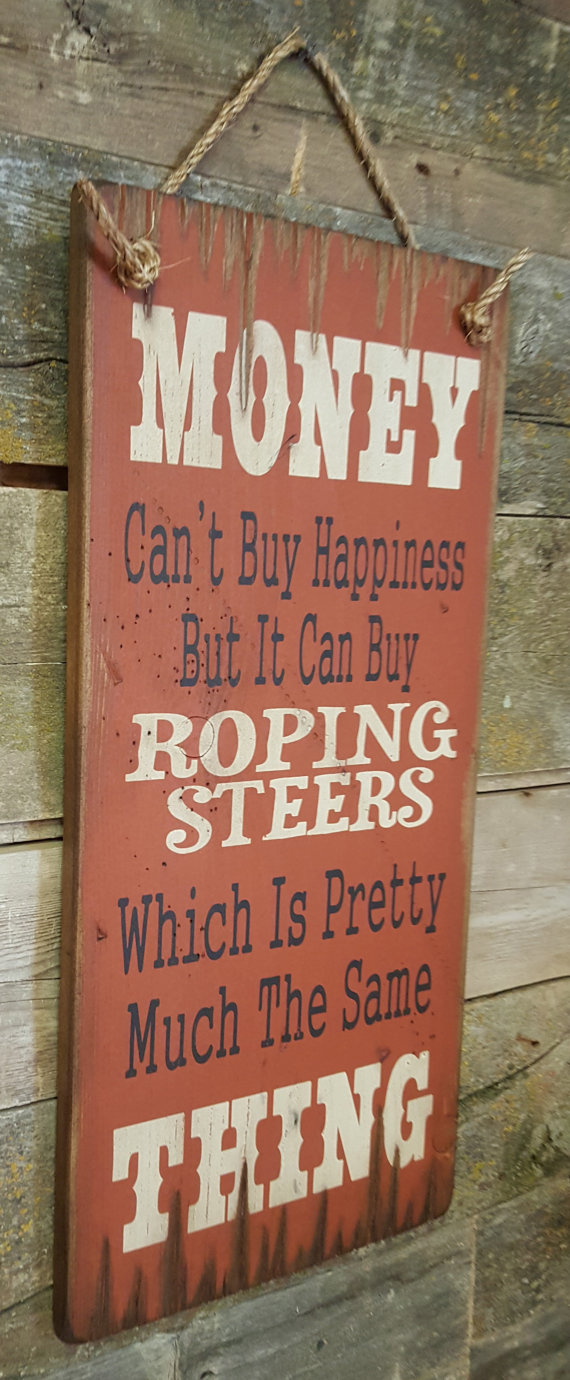 Money Can't Buy Happiness, But It Can Buy Roping Steers, Which Is Pretty Much The Same Thing!! When you have a roping addiction, you might also have a roping steer addiction, to feed it! This rusty red background sign measures 11x24 and comes with the grass rope hanger for easy hanging! Handcrafted with pride!!