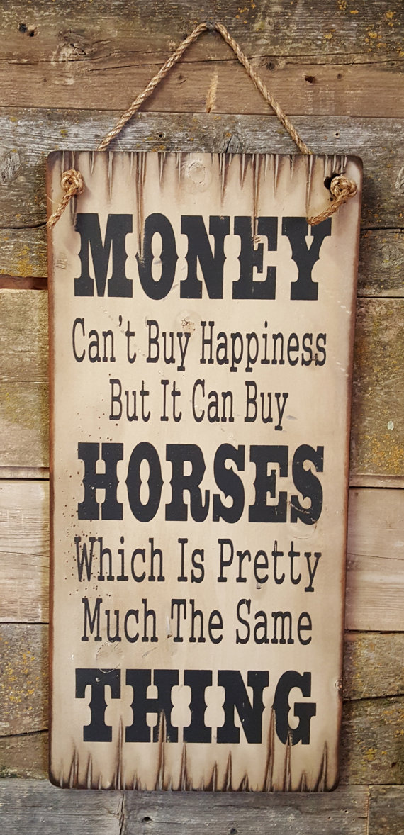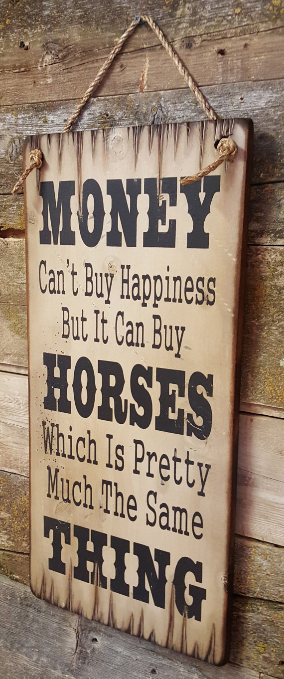 Money Can't Buy Happiness, But It Can Buy Horses, Which Is Pretty Much The Same Thing!! Are you or a friend addicted to horses!!?? Sometimes I ask myself that same question! This white background sign measures 11x24 and comes with the grass rope hanger for easy hanging! Handcrafted with pride!!