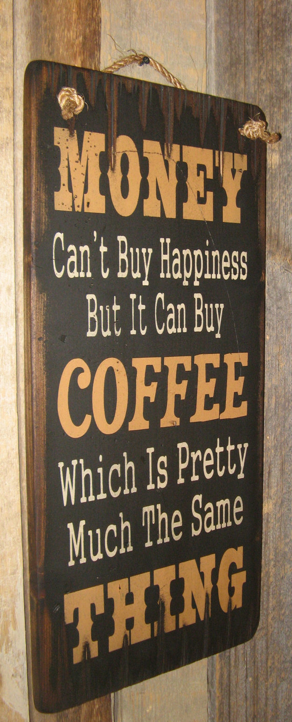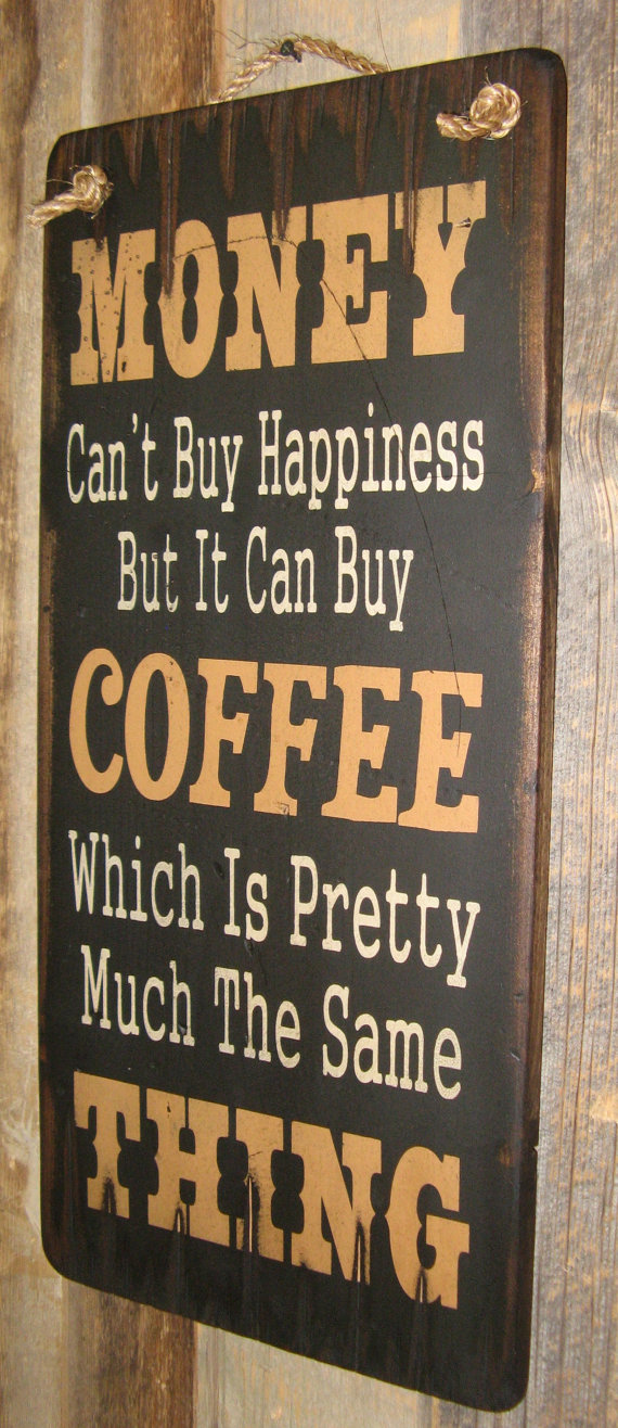 Money Can't Buy Happiness… But It Can Buy Coffee, Which Is Pretty Much The Same Thing! This is my new favorite sign! I love my morning coffee This black background sign measures 11x24 and comes with the grass rope hanger for easy hanging. Handcrafted with pride!!