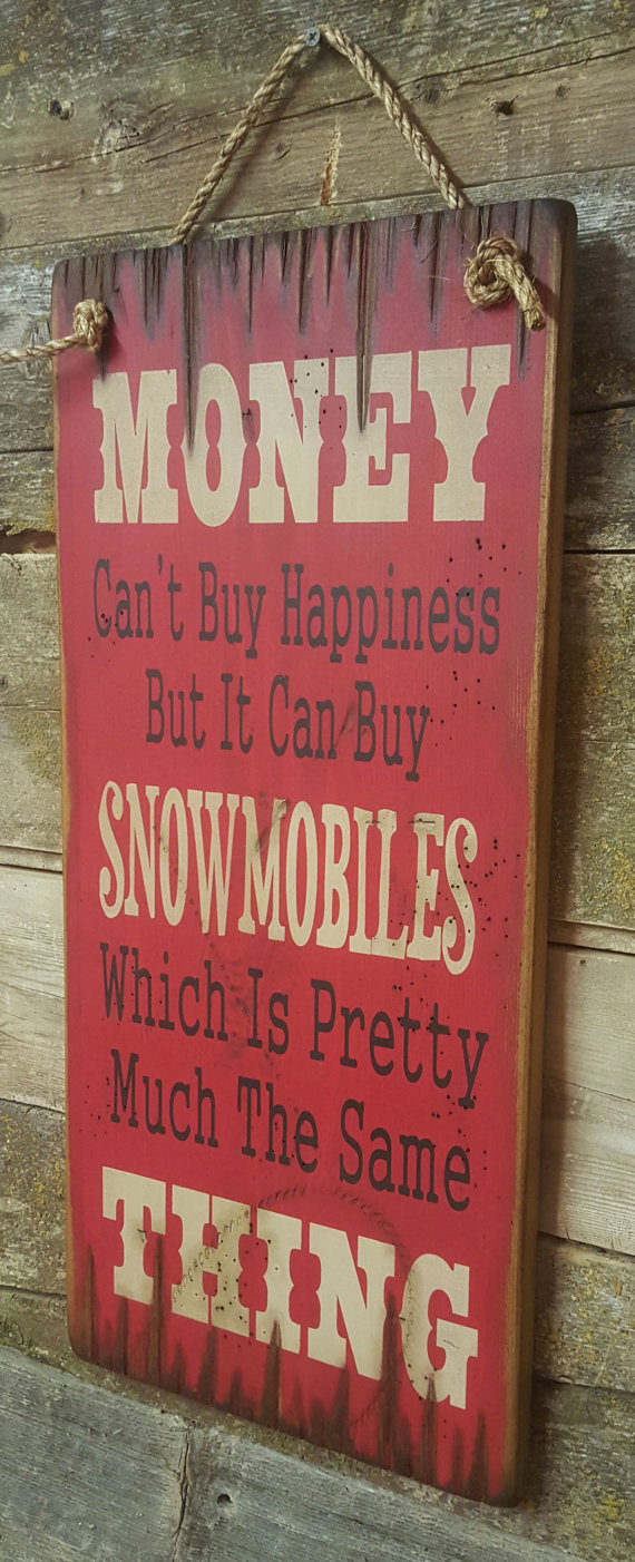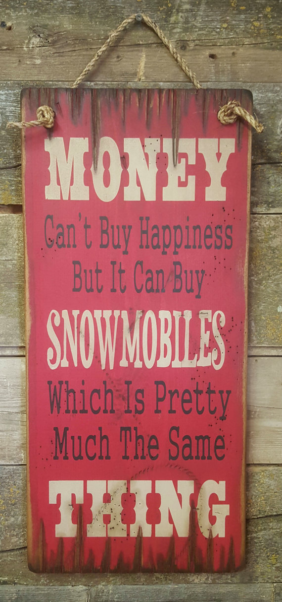 Money Can't Buy Happiness But It Can Buy Snowmobiles Which Is Pretty Much The Same Thing!!! Yes, yes this is true... There is just something about that white stuff! This red background sign measures 11x24 and comes with the grass rope hanger for easy hanging. Handcrafted with pride!