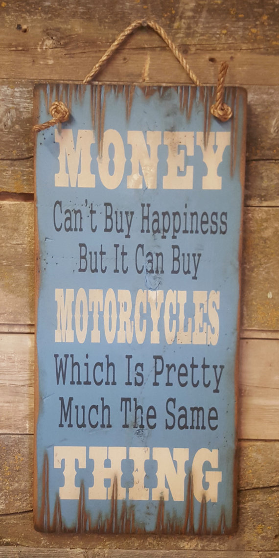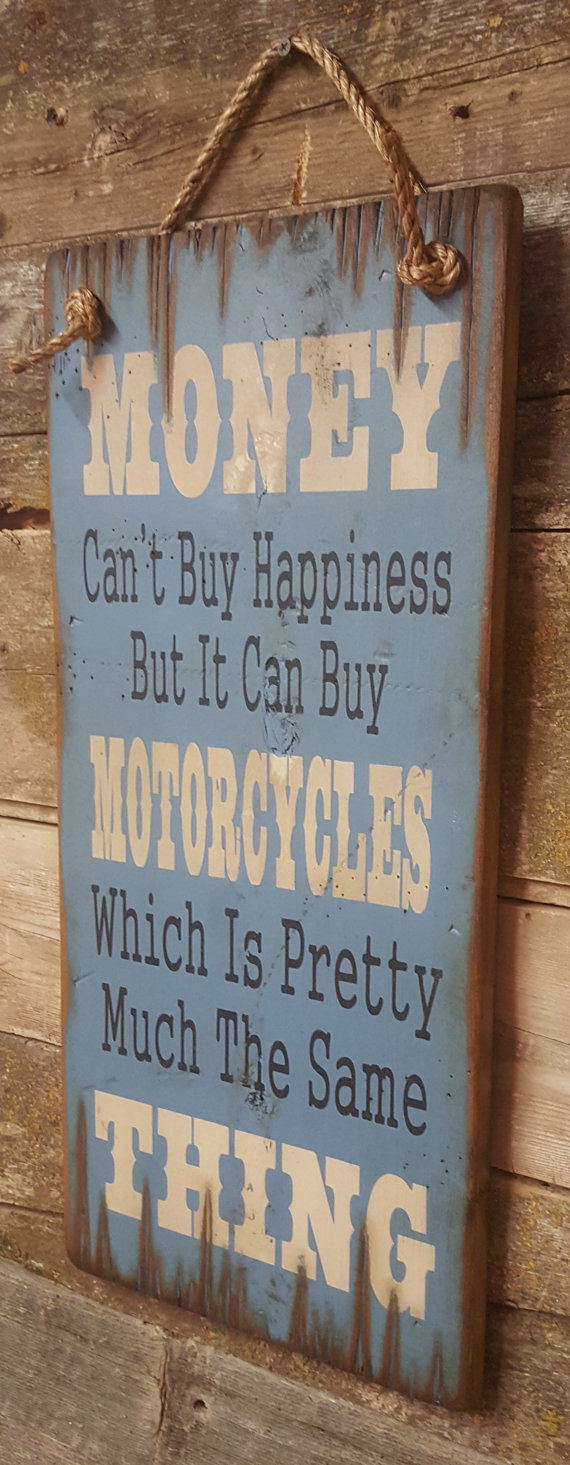 Money Can't Buy Happiness But It Can Buy Motorcycles Which Is Pretty Much The Same Thing!!! Brahhhpppp! If motorcycles are your passion, then this sign is for you This light blue background sign measures 11x24 and comes with the grass rope hanger for easy hanging. Handcrafted with pride!