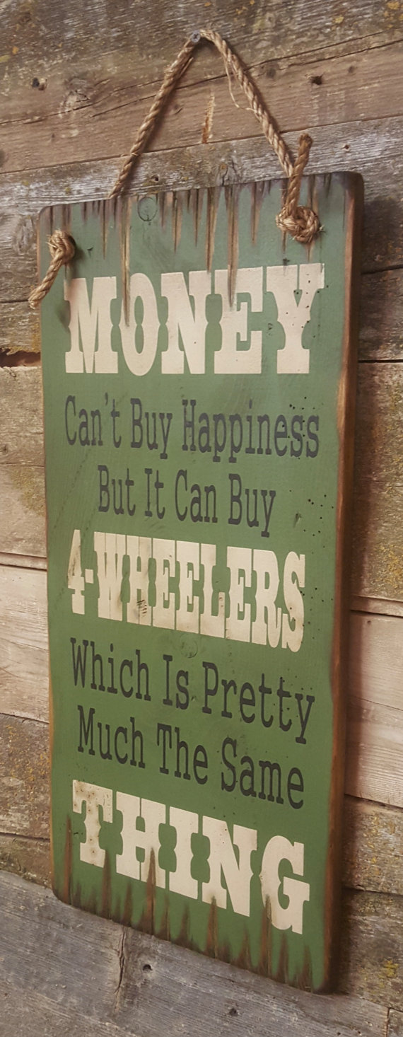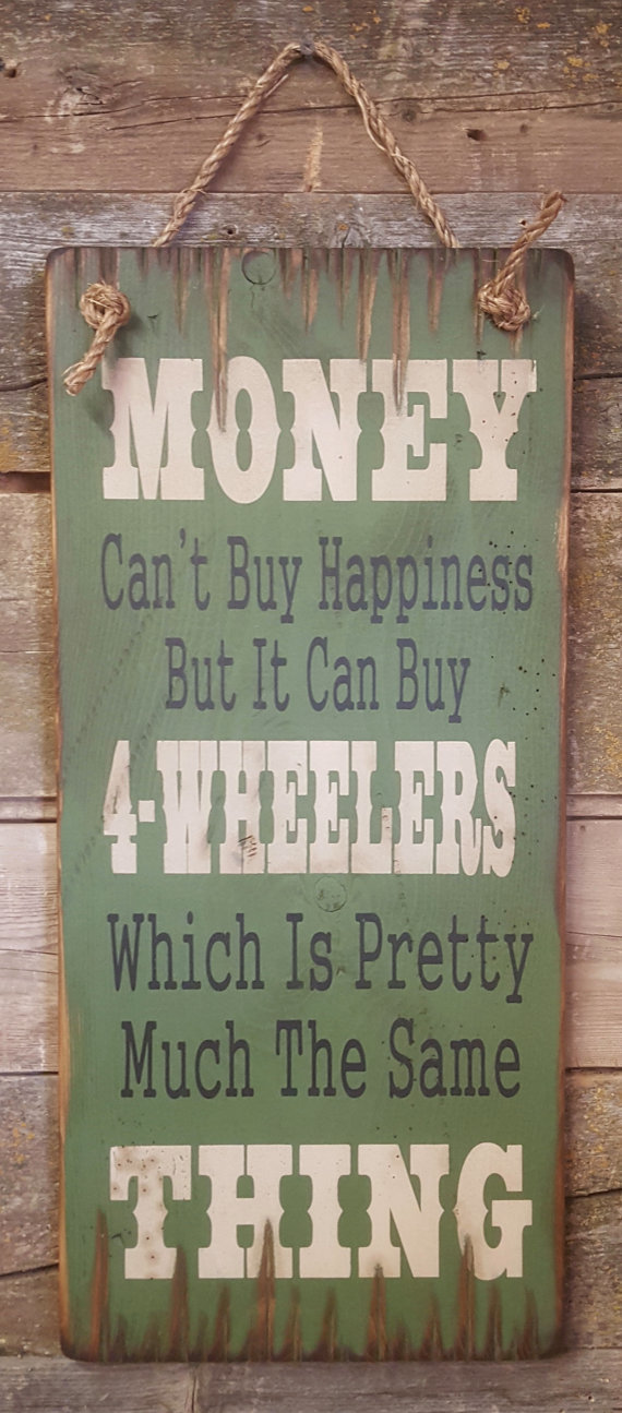 Money Can't Buy Happiness But It Can Buy 4-Wheelers Which Is Pretty Much The Same Thing!!! Let's face it, 4-Wheelin' ain't for the faint hearted!! This dark green background sign measures 11x24 and comes with the grass rope hanger for easy hanging. Handcrafted with pride!