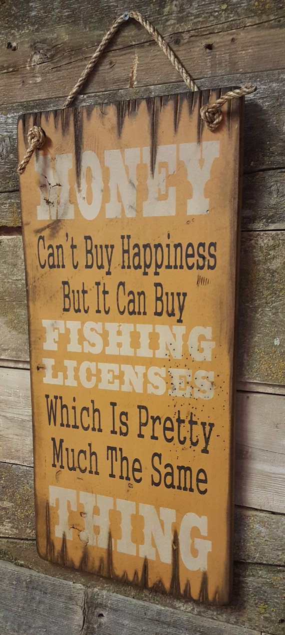 Money Can't Buy Happiness, But It Can Buy Fishing Licenses, Which Is Pretty Much The Same Thing! Here's the perfect gift for that person in your life that loves to fish, more than life itself. The background on this sign is antique yellow. The sign measures 11x24 and comes with the grass rope hanger for easy hanging! Handcrafted with pride!