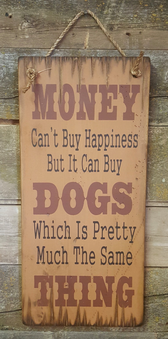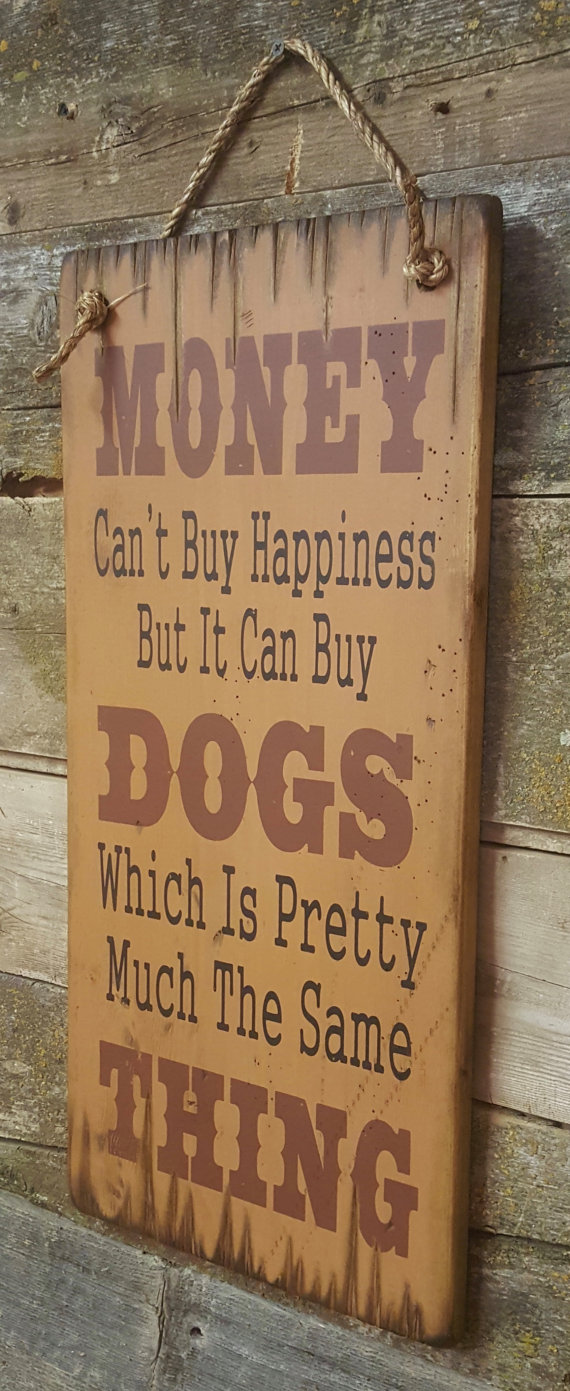 Money Can't Buy Happiness But It Can Buy Dogs Which Is Pretty Much The Same Thing... Who said you can't have too many dogs?? This tan background sign measures 11x24 and comes with the grass rope hanger for easy hanging. Handcrafted with pride!