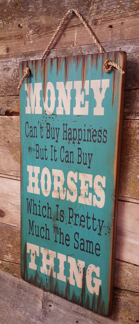 Money Can't Buy Happiness, But It Can Buy Horses, Which Is Pretty Much The Same Thing!! Are you or a friend addicted to horses!!?? Sometimes I ask myself that same question! This turquoise background sign measures 11x24 and comes with the grass rope hanger for easy hanging! Handcrafted with pride!!