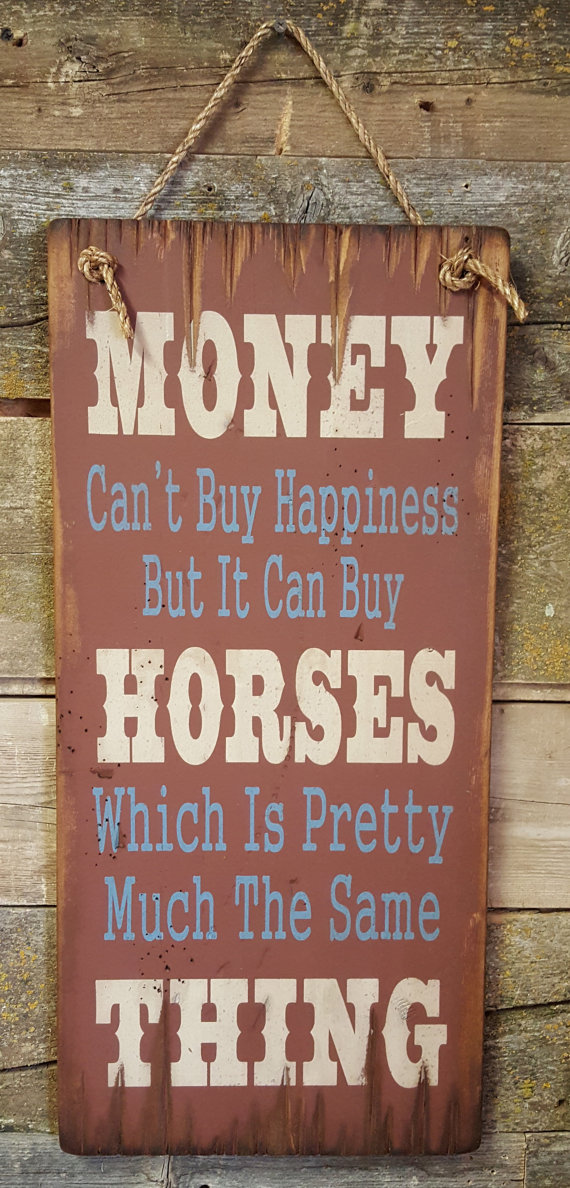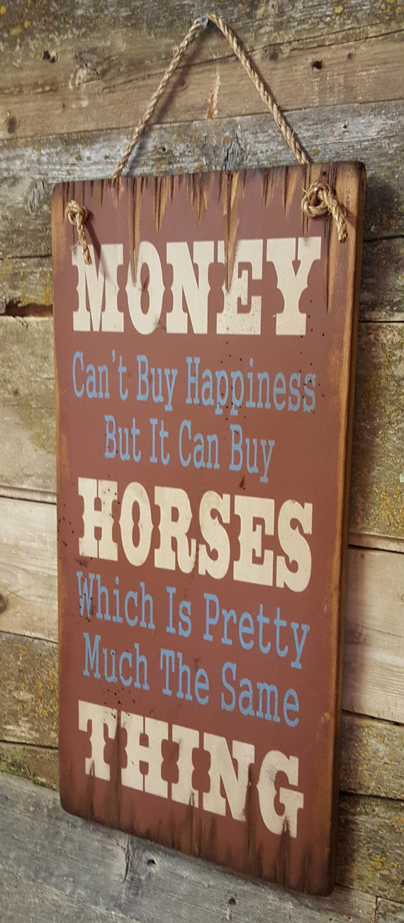 Money Can't Buy Happiness, But It Can Buy Horses, Which Is Pretty Much The Same Thing!! Are you or a friend addicted to horses!!?? Sometimes I ask myself that same question! This rust background sign measures 11x24 and comes with the grass rope hanger for easy hanging! Handcrafted with pride!!