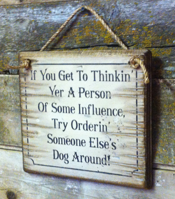 If You Get To Thinkin’ You Are A Person Of Some Influence, Try Orderin’ Someone Else’s Dog Around! This humerous sign is the truth when it comes to Man’s Best Friend! This sign has a white background and measures 12×12 and comes with the grass rope hanger for easy hanging. Handcrafted with pride!